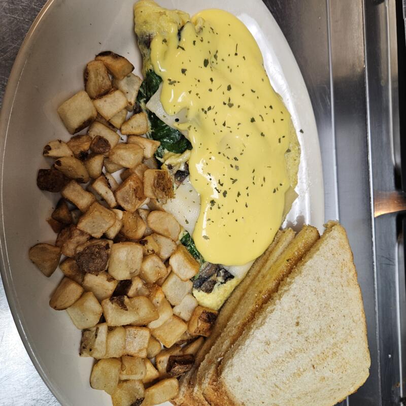 Served with breakfast potatoes and piece of toast: Sour Dough | Rye | Seven Grain | Gluten free bread or gluten-free English muffin available +$2.00 | Sub side salad +$2.00